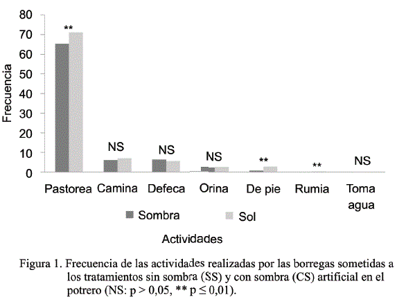 Frecuencia de las actividades realizadas por los animales. En la figura 1 se observa la frecuencia de las distintas actividades realizadas por las borregas. La actividad predominante fue el pastoreo, significativamente mayor (p ≤ 0,01) en el SS que en el CS, con valores promedio de 71,0 y de 65,2 %, respectivamente. Este resultado demostró que, independientemente de la presencia o no de sombra, los animales dedicaban más de la mitad del tiempo al pastoreo o consumo de pasto, si se tiene en cuenta que estaban sometidos a un manejo de pastoreo restringido. Las borregas en crecimiento se encontraban en condiciones de semiestabulación, lo que implicaba un mayor provecho al tiempo de pastoreo para poder cubrir sus necesidades de ingestión de materia seca. Similares resultados fueron reportados por Oliveira et al. (2013), quienes no hallaron influencia de la presencia de sombra artificial, proporcionada con malla de polipropileno con 80 % de retención lumínica, sobre el número de animales que consumían, rumiaban o estaban en ocio, en comparación con los animales del tratamiento sin sombra.
