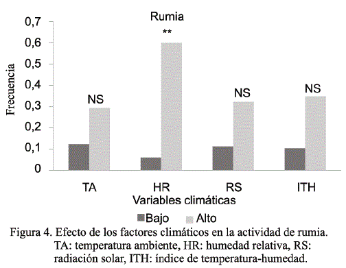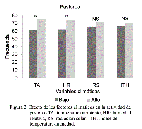 Efecto de las variables climáticas sobre las actividades realizadas por los animales. En el caso del efecto de las variables climáticas sobre las actividades de los animales, se puede destacar la importancia relativa que tuvo el pastoreo con respecto a las otras actividades. En el caso de la actividad pastoreo (fig. 2), se obtuvieron diferencias (p ≤ 0,01) para las categorías establecidas en el caso de TA y HR, con promedios de 60,9 y 74,7 % y 61,0 y 74,1 %, respectivamente, para baja y alta. Es decir, a pesar de que la TA y la HR eran más elevadas, la frecuencia de pastoreo resultó significativamente superior. Los valores promedios de pastoreo en ITH bajo y alto estuvieron en 65,9 y 70,4 %, respectivamente (p > 0,05). Al parecer, en condiciones de alerta por estrés no se presentaron reducciones importantes en el consumo de pasto. Otra posible explicación a estos resultados pudiera ser el hecho de que en ovinos de pelo se requieran ITH superiores a los ocurridos, para que haya una reducción en la frecuencia de ovejas pastoreando. En tal sentido, Reyes (2016) reportó que el punto de quiebre del ITH en ovejas West African está cercano a 80 unidades. Cuando el ITH supera este umbral, las ovejas presentan temperaturas corporales ≥ 39,5 °C. La RS no fue significativa (p > 0,05), con promedios bajos y altos según los índices establecidos de 65,4 y 70,3 %, respectivamente (fig. 2).