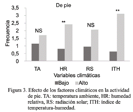 En la actividad de pie (fig. 3) se observaron diferencias (p ≤ 0,01) entre las frecuencias para las categorías establecidas (baja y alta), en HR e ITH, con promedios de 0,8 y 2,4 % y de 0,6 y 3,1 %, respectivamente. También se observó que la RS no fue significativa entre valores bajos y altos; sin embargo, los promedios estuvieron entre 0,9 % (bajo) y 2,0 % (alto), lo que pudo incidir en que los animales estuvieran de pie más en SS que en CS. La posición de pie podría evidenciar la activación de mecanismos conductuales para la reducción de la incidencia de los rayos solares; sin embargo, dicha posición en función del sol no fue evaluada, y es de interés incorporarla en estudios futuros. Por otra parte, la ausencia de un sitio de resguardo pudiera influir en la mayor proporción de animales de pie en el tratamiento SS. Kanjanapruthipong et al. (2015) reportaron que parte de los mecanismos conductuales de pérdida de calor en vacunos es permanecer un mayor tiempo en posición parada, pero sin consumir alimentos, y un menor tiempo en posición acostada cuando son sometidos a estrés calórico.