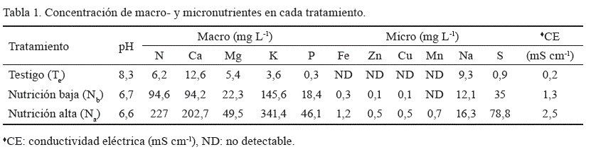 Tratamientos. Se aplicaron dos tratamientos de solución nutritiva (tabla 1): 1) alta concentración de nutrientes (Na), y 2) baja concentración de nutrientes (Nb); y un testigo con agua sin nutrientes (Te).