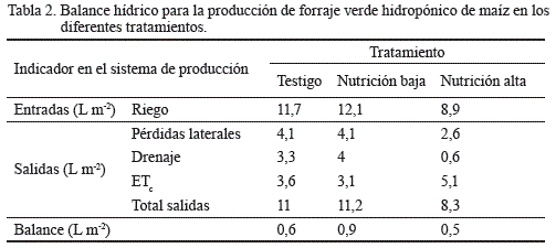 Las soluciones nutritivas fueron aplicadas en cada evento de riego, mediante fertirriego por nebulización. La programación del riego se realizó por tiempos fijos mediante un programador (timer), con una duración de 15 segundos y una frecuencia cada 45 minutos, en un intervalo horario entre las 6 a. m. y las 6 p. m. En cada tratamiento se registraron las entradas y salidas de agua en el sistema de cultivo, durante 11 días del ciclo de cultivo (tabla 2).