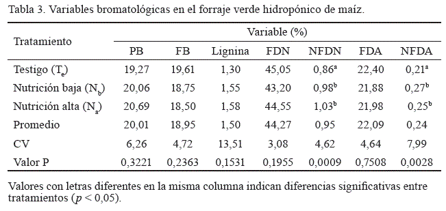Al final del ciclo de cultivo, los tratamientos de nutrición no afectaron el rendimiento fresco de forraje verde hidropónico de maíz, con valores de 15,20; 15,27 y 15,37 kg m-2 para Te, Nb y Na, respectivamente. Tampoco hubo efecto en los contenidos de PB, FB, lignina, FDN y FDA.