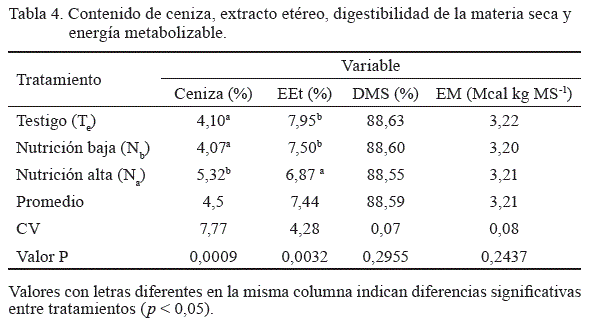 Los contenidos de ceniza y EEt presentaron diferencias estadísticas (p < 0,05) entre tratamientos (tabla 4). Na mostró un contenido de ceniza ligeramente superior al de Te y Nb, sin diferencias entre estos últimos. Para el EEt, no hubo diferencias estadísticas entre Te y Nb, que difirieron de Na. Por otra parte, no hubo efecto de la nutrición mineral en la DMS ni en el contenido de EM, con promedios de 88,6 % y 3,20 Mcal kg MS-1, respectivamente (tabla 4).