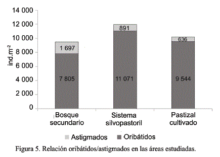 En los sistemas en estudio esta relación fue favorable a Oribatida, grupo de ácaros detritívoro, indicador de estabilidad y fertilidad del suelo, por lo que se puede afirmar que el medio edáfico se benefició con estos usos (fig. 5). Tanto el bosque secundario como el sistema silvopastoril garantizaron las condiciones bióticas y abióticas para el desarrollo de la mesofauna; en cuanto al pastizal cultivado, también este uso aseguró una buena cobertura del suelo y un aporte de material orgánico que redundó en el buen establecimiento de la mesofauna edáfica.