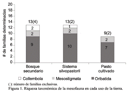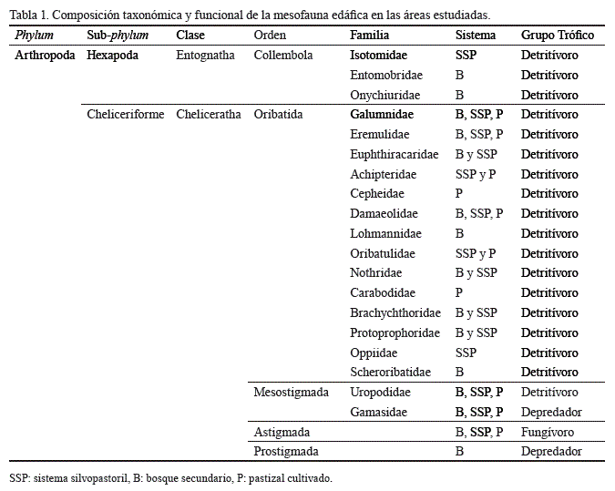 Composición taxonómica de la mesofauna del suelo en las áreas. Durante el estudio, se recolectó un total de 399 individuos pertenecientes al phylum Arthropoda, representado por dos sub-phylum, dos clases, cinco órdenes y 19 familias. En particular, la clase Cheliceratha estuvo compuesta por cuatro órdenes y 16 familias. El análisis a nivel de orden mostró la existencia de 5 órdenes en el bosque secundario, 4 en el sistema silvopastoril y 3 en el pastizal (tabla 1).