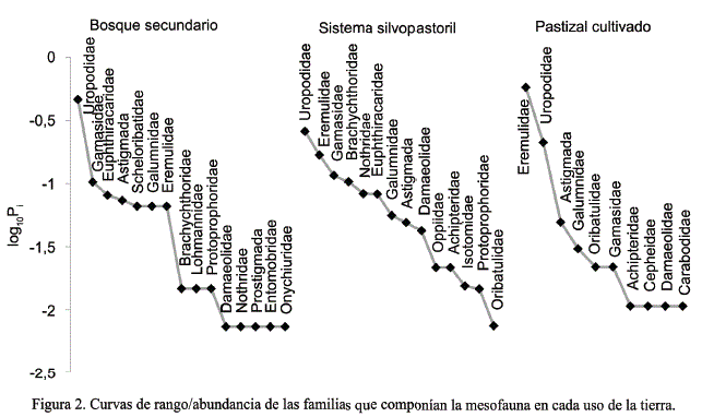 Según la expresión de las curvas de rangos de abundancia, se podría señalar el bosque secundario en primer lugar; el sistema silvopastoril en segundo, con mayor diversidad; y el pastizal cultivado como el sistema de uso con menor diversidad de la mesofauna del suelo.