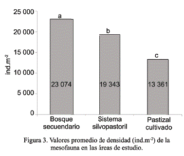 Densidad de la mesofauna del suelo en las áreas. Los mayores valores de densidad promedio de la mesofauna del suelo (fig. 3) se encontraron en el bosque secundario (23 075 ind.m-2); los intermedios, en el sistema silvopastoril (19 343 ind.m-2); y los menores, en el pastizal (13 361 ind.m-2).
