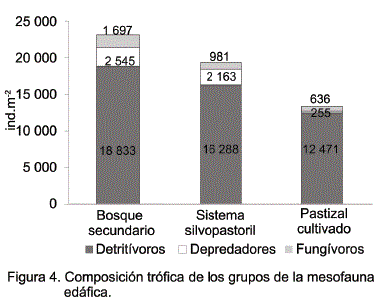Se debe destacar el incremento en el número de individuos detritívoros con respecto al resto de los grupos tróficos en las tres áreas, con un pico en el bosque secundario y en el sistema silvopastoril (fig. 4). En el caso del bosque, este ha sido favorecido por la escasa o la nula intervención antrópica, lo que ha redundado en una mayor estabilidad del medio edáfico y de su diversidad asociada. En el sistema silvopastoril, el establecimiento de este grupo trófico se favoreció por la incorporación de materia orgánica, la cobertura y la mejora de las condiciones de fertilidad por la presencia de L. leucocephala, que es una leguminosa que fija nitrógeno atmosférico al suelo.