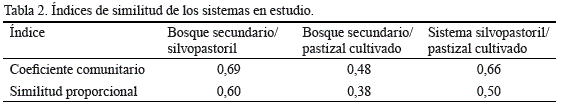 Con el análisis de la similitud proporcional (SP), se corroboró la semejanza en los valores de abundancia entre el bosque secundario y el sistema silvopastoril, con marcada diferencia respecto a los valores obtenidos para el pastizal cultivado.