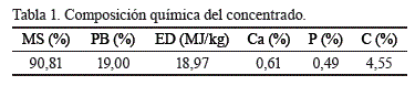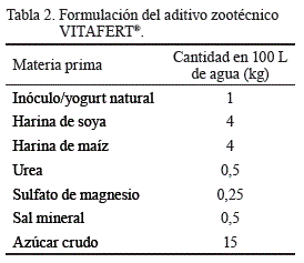 Manejo y alimentación. Los animales en estudio fueron alimentados según las normas establecidas por IIP (2015), y se les adicionó el aditivo zootécnico VITAFERT®. Este se elaboró según la metodología de Elías y Chiliborste (2010), sustituyendo la miel final por azúcar crudo para consumo animal. Para producirlo se utilizaron tanques plásticos de 220 L, paletas de madera para agitar y materia prima (maíz, harina de soya, urea, sal mineral, sulfato de amonio, azúcar crudo para consumo animal y 1 L de yogurt natural). En las tablas 1 y 2 se muestra la composición química del concentrado y la formulación del aditivo.