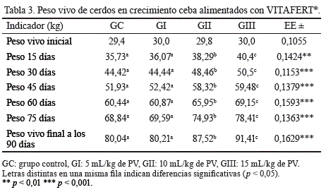 En las tablas 3 y 4 se muestran los indicadores productivos en los cerdos en crecimiento ceba. Se observó una mejora en dichos indicadores en GII y GIII con respecto al control y a GI (p < 0,01), con los mejores valores en GIII. Entre GC y GI no se observaron diferencias significativas, lo que pudo deberse a que la dosis de 5 mL/kg de peso vivo no tenía la concentración necesaria de microorganismos para producir un efecto positivo.