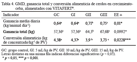Abstract: The objective of the study was to evaluate the effect of the zootechnical additive VITAFERT® on the productive and health performance in pigs, in the growing-fattening stage. Four inclusion levels of VITAFERT® were used, which constituted the treatments: CG: control group, GI: 5 mL/kg of live weight (LW), GII: 10 mL/kg of LW and GIII: 15 mL/kg of LW, with five repetitions each and a completely randomized design. In the case of the productive variables variance analysis was used; and Duncan’s test was applied to compare the differences among means, through the package INFOSTAT®. To establish whether there were statistical differences in the incidence of diarrheas and mortality, analysis of proportions was carried out and ComparPro version 1 was used. As the VITAFERT® levels were increased there was a rise (p < 0,001) in the mean daily gain of live weight (0,64; 0,64; 0,71 and 0,75 kg), which brought about an increase (p < 0,001) in the total live weight gain at the end of rearing (57,36; 57,36; 64,30 and 67,68 kg). The feed conversion (kg of DM per kg of LW increase) was favored by the increase (p < 0,001) of the product doses, with values of 4,38; 4,37; 3,90 and 3,73. Likewise, when including the zootechnical additive there was a decrease in the incidence of diarrhea. The inclusion of VITTAFERT® in the feeding of pigs in the growing-fattening stage improved the productive and health performance, and the best results were obtained with the highest dose.