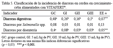 En la tabla 5 se muestran la incidencia de diarreas durante la etapa experimental. Todos los tratamientos difirieron del grupo control en los indicadores diarreas digestivas y diarreas por disentería, con la menor incidencia en el GIII. En el caso de las diarreas por Salmonella spp., no hubo diferencias entre los tratamientos.