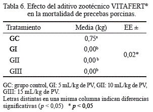 Los efectos del aditivo zootécnico VITAFERT® sobre la mortalidad en cerdos en la fase de crecimiento-ceba se muestran en la tabla 6; se hallaron diferencias entre el tratamiento control y los experimentales, con el mayor valor en el control. En los tratamientos en que se administró VITAFERT® no hubo muertes, lo que evidenció la efectividad del producto para disminuir la mortalidad en esta categoría y indica que este puede ser usado de forma preventiva. También García-Hernández et al. (2016) encontraron un efecto positivo al incluir un preparado microbiano a base de bacterias ácido lácticas y levaduras en dietas de cerdos posdestete.