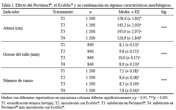 Al analizar el comportamiento de las variables que se evaluaron durante el establecimiento (tabla 1), se constató que no hubo diferencias significativas cuando se aplicaron los tratamientos T2 y T3, que difirieron estadísticamente de T4 y de T1; en el caso de la altura, estos dos últimos no difirieron entre sí. Ello indica que los dos bioproductos (EcoMic® y Pectimorf®) pueden ser un complemento adicional para la nutrición de esta arbórea después de romper la dormancia con la ET.