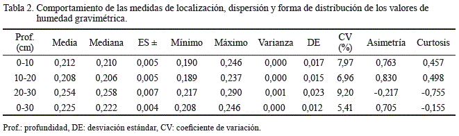 Se determinó la humedad gravimétrica, también a lo largo del transecto, cada 3 m y en los diez puntos múltiplos de 6 (6, 12, 18… 60). El análisis exploratorio de datos realizado a la humedad gravimétrica se muestra en la tabla 2.