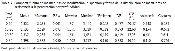 Además, el comportamiento de la curtosis en las tres profundidades indicó que la distribución de la resistencia a la penetración tuvo un pico menos agudo (curtosis platicúrtica) que la distribución normal, al mostrar valores menores que 1 (Freixa-Blanxart et al., 1992); ello indica que en las colas hubo más valores acumulados que en las colas de una distribución normal.