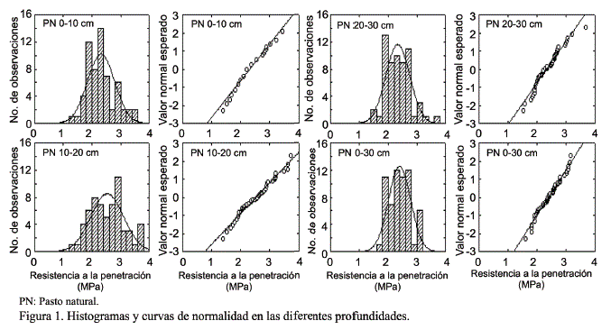 De esta forma, los datos de resistencia a la penetración en las profundidades de 10-20 y 0-30 cm no difirieron significativamente de una población normal.