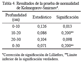 Los resultados de la prueba de normalidad de Kolmogorov-Smirnov (tabla 4) mostraron que en las capas de 0-10 y 20-30 cm no hubo una distribución normal de los datos. De forma diferente se comportó la resistencia a la penetración en las profundidades de 10-20 y 0-30 cm, donde las pruebas de normalidad mostraron resultados con una significación de 0,200.