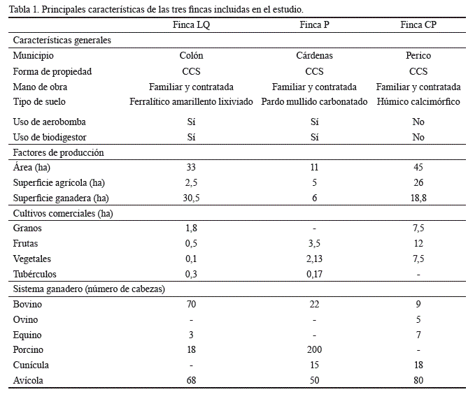 aracterísticas de las fincas en estudio. El estudio se realizó en tres fincas ubicadas en la provincia de Matanzas, Cuba: LQ (municipio Colón), P (Cárdenas) y CP (Perico); las cuales fueron modelizadas en redes de flujo de nitrógeno (N) en el período de un año. Se usaron los flujos de N para llevar a cabo el análisis, ya que este recurso es a menudo el factor que limita la producción en la agricultura de bajos insumos y puede ser gestionado por los productores. Se utilizó un año como unidad temporal de análisis, porque es un período común para evaluar la producción agrícola.