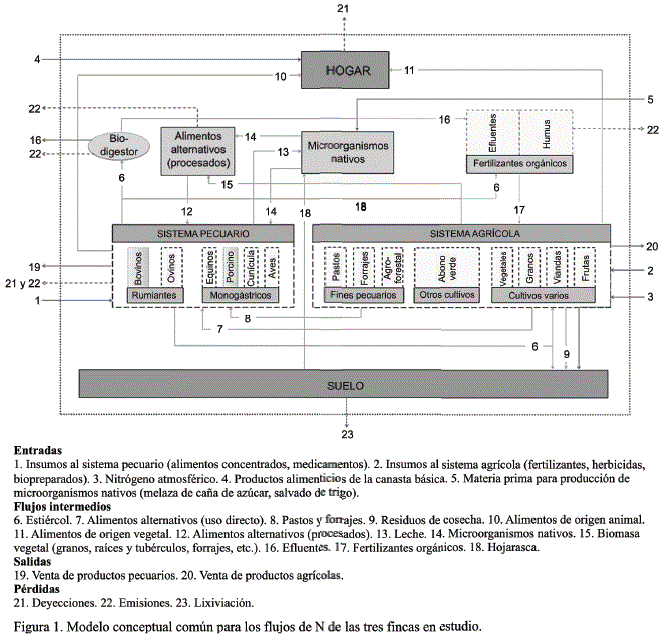 Conceptualización del sistema. Los tres agrosistemas se conceptualizaron como sistemas compuestos por varios compartimentos, que representan las principales actividades agrícolas, el suelo y el hogar. Los compartimentos son unidades que producen y consumen biomasa. Los agrosistemas se representan como una red en la que los enlaces entre los compartimentos representan los flujos de biomasa, en este caso referidos a kilogramos de N al año, dentro de ella. Las importaciones de N y las exportaciones se representan como entradas y salidas, respectivamente, entre las fincas y el medio externo. Las pérdidas (disipación por volatilización, lixiviación, muerte de animales) también se tuvieron en cuenta como salidas de los compartimentos. En la figura 1 se representa el modelo conceptual común para los tres agrosistemas estudiados. Una descripción más detallada del método de conceptualización del sistema fue realizada por Stark (2016).