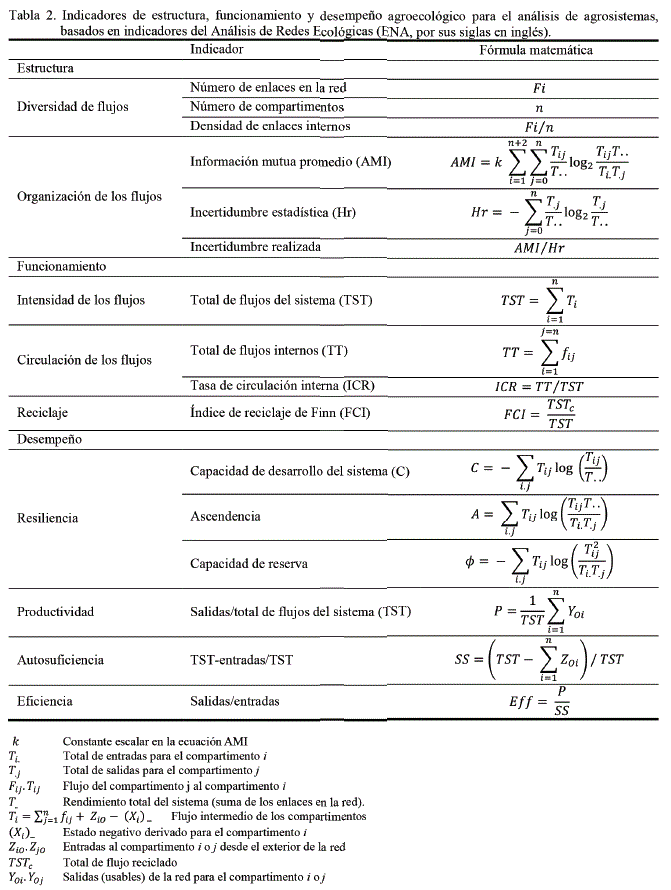 Los datos recopilados y estimados se usaron para construir una matriz para cada caso de estudio; y, basado en la matriz de flujos, se calcularon los indicadores de estructura, funcionamiento y desempeño (tabla 2), adaptados a los agrosistemas por Rufino et al. (2009a) y Stark (2016).