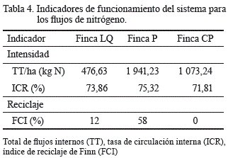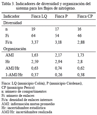 La densidad de enlaces internos (Fi/n), indicador que evidencia la diversidad de flujos, fue alta para los tres estudios de caso (tabla 3), con valores que variaron entre 3,37 y 2,88. Desde el punto de vista del uso del N, la finca LQ fue la más diversa y en CP se obtuvo el valor más bajo para este indicador. No obstante, los valores no variaron mucho entre fincas, e indican que se trata de sistemas diversos y complejos.
