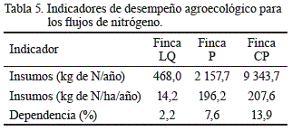 En concordancia con lo expuesto anteriormente, la finca CP presentó el valor más alto de dependencia de N (13,9 %). Las fincas P y LQ, con una mayor proporción de área destinada a la actividad ganadera, mostraron niveles inferiores de dependencia de N. En el caso de CP, la excreta animal tuvo el mayor peso en los insumos importados a la finca; mientras que los concentrados para la alimentación animal representaron un alto porcentaje de los flujos de entrada en la finca P.
