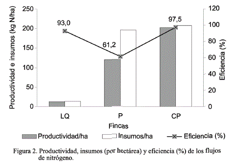 Stark et al. (2018) obtuvieron, en varios estudios de caso en Cuba, niveles de productividad que variaron entre 22 y 78 kg de N/ha; mientras que, en otras fincas evaluadas en Brasil y Guadalupe, dependiendo de la región, la productividad varió de 13 a 69 kg de N/ha. Tales resultados son inferiores a los de esta investigación, a excepción de la finca LQ.