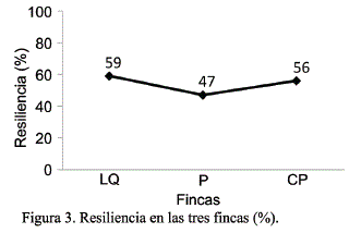 Los valores de resiliencia del sistema (fig. 3) fueron similares para las tres fincas, aunque ligeramente superiores para LQ y CP, e indican que los tres agrosistemas tienen amplio margen para su progreso, pues se encuentran a la mitad de su potencial.