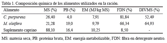 Los tratamientos experimentales consistieron en una ración constituida por cantidades crecientes de M. oleifera (20, 40 y 80 %), como remplazo de C. purpureus (80, 60, 20 %), y un control con forraje de C. purpureus cv. Cuba OM-22 a voluntad y concentrado (6 g kg PV-1) en una sola ocasión (8:30 a.m.). La ración se ofreció a razón del 3,5 % del peso vivo en base seca, cantidad mínima de consumo para cabras en estado de mantenimiento según lo establecido por Morand-Fehr (2005), más 25 % para tratar de disminuir la selectividad y el nivel de rechazo al siguiente día. La totalidad de los animales tuvieron acceso a agua y sales minerales a libre voluntad.