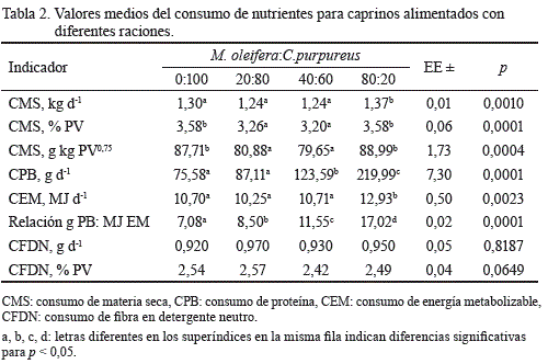 En la tabla 2 se muestra que el consumo absoluto de materia seca (kg día-1) difirió entre tratamientos (p = 0,001); semejante comportamiento estadístico mostró el consumo de materia seca relativo al peso vivo (% PV, g kg PV0,75). El valor más alto se alcanzó con 80 % de inclusión de moringa en la ración, similar al control, aunque este último incluyó suplementación (6 g kg PV-1) con un sustrato energético y nitrogenado de rápida fermentación que favorece la actividad enzimática de los microorganismos y la digestión de la dieta (Blas-Beorlegui et al., 1995).