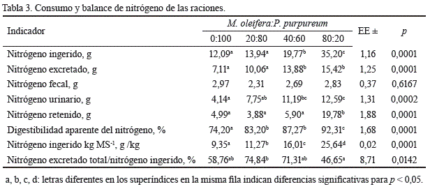 Efecto de diferentes proporciones de Moringa oleifera:Cenchrus purpureus sobre el consumo voluntario y el balance de nitrógeno