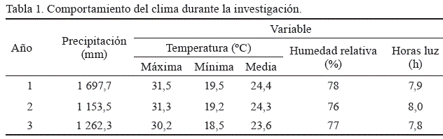 El estudio se desarrolló en áreas de la Estación Experimental de Pastos y Forrajes Cascajal, ubicada en el municipio Santo Domingo –provincia Villa Clara, Cuba–, a 22º 36ʹ de latitud norte y 80º 04ʹ de longitud oeste, a 60 msnm; sobre un suelo Gley Nodular Ferruginoso, petroférico, dístico, caracterizado por presentar pH ácido (4,2), así como bajos contenidos de materia orgánica (1,91 %), N total (0,40 %) y P asimilable (1,90 mg/100 g). En función de estas características, se considera como un suelo ácido y de baja fertilidad (Hernández-Jiménez et al., 2015). Las variables climatológicas se muestran en la tabla 1.