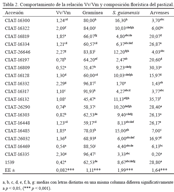 En la tabla 2 se muestran los resultados de las variables en estudio (relación Vv/Vm y composición florística del pastizal) en cada una de las asociaciones estudiadas. Trece de las 19 accesiones evaluadas (68,4 %) finalizaron con una relación Vv/Vm favorable, es decir, con una tasa de producción de vástagos vivos por encima de 1 (Machado, 2002); se destacaron CIAT-16335, CIAT-16332 y CIAT-26646 por terminar con un índice superior a dos, las cuales mostraron diferencias altamente significativas (p < 0,001) al compararlas con el resto de los tratamientos. Sin embargo, aunque CIAT-16322 también culminó el período experimental con un índice superior a dos, mostró diferencias estadísticas respecto a las tres mencionadas con anterioridad.