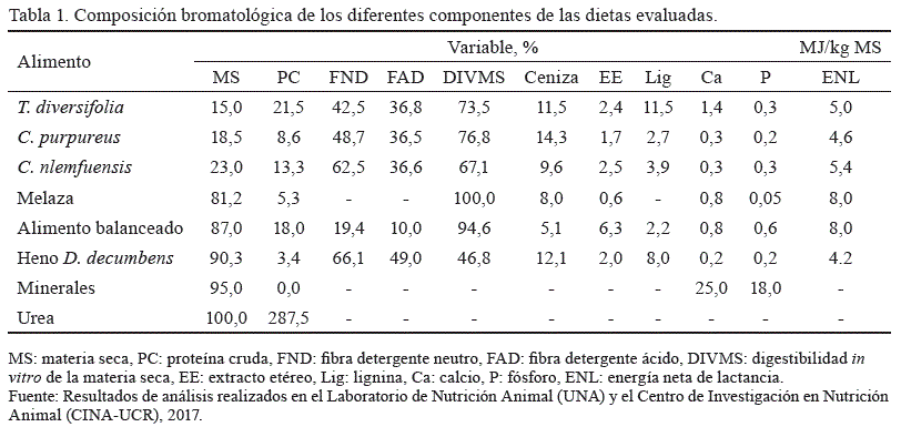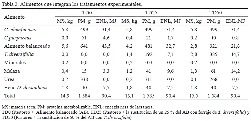 Alimentación y tratamientos. Las vacas fueron alimentadas con una dieta de pasto Cynodon nlemfuensis Vanderyst en un sistema de pastoreo rotacional en potreros de 3 900 m2 como promedio, con periodos de ocupación de un día y 26 días de descanso y una carga animal de 2,5 animales/ha. Además del consumo de forraje en los potreros, los animales fueron suplementados dos veces al día en los cepos de la sala de alimentación, con T. diversifolia y alimento balanceado, y otros alimentos, como: Cenchrus purpureus (Schumach.) Morrone, melaza, paca de Digitaria decumbens Stent cv. Transvala, minerales y agua a libre consumo durante todo el día. La composición bromatológica de cada uno de los alimentos ofrecidos se describe en la tabla 1.