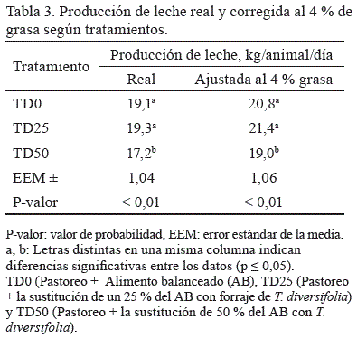 Al sustituir el 25 % del AB por forraje fresco de T. diversifolia no se hallaron diferencias significativas en la producción de leche con respecto al tratamiento TD0. Este resultado podría estar asociado a un consumo similar de materia seca, proteína y energía en estos dos tratamientos.
