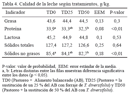 En cuanto al porcentaje de proteína en leche (tabla 4), el tratamiento TD50 presentó diferencia significativa (32,5 g/kg) con respecto al TD0 (33,9 g/kg), lo que indica que la sustitución del 50 % del AB por forraje de T. diversifolia en la dieta disminuyó significativamente (p < 0,05) el contenido de proteína en leche.