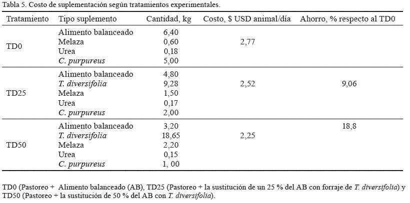 Valoración económica. El análisis económico se calculó considerando solo el costo de la suplementación (T. diversifolia, AB, C. purpureus, melaza y urea). El precio por kg de materia fresca de C. purpureus fue de 0,01 USD, según los resultados de Villalobos et al. (2015).