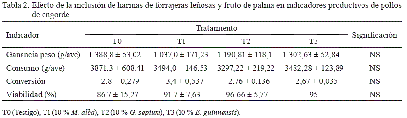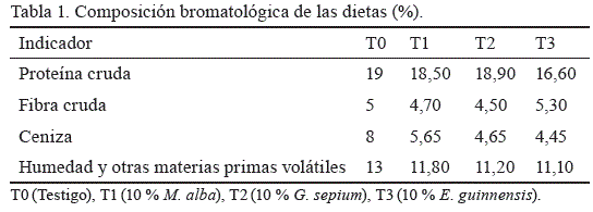 Lo mismo ocurrió con lo informado por Herrera y Díaz (2016), cuando compararon M. alba y G. sepium en dietas de pollos cuellos desnudos. En este caso, la ganancia de peso diaria y el consumo (9 059,96 g) fue mayor para la morera y los menores valores (8 557,045 g) en G. sepium, por lo que recomiendan la inclusión de esta hasta el 5 % en la dieta. A su vez no encontraron diferencias en la conversión entre las dietas, similar al presente estudio, porque las dietas evaluadas tenían una composición nutricional análoga.
