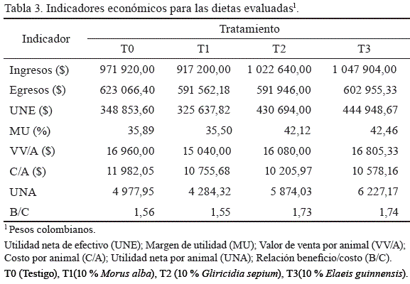 En cuanto a los ingresos, la utilidad neta de efectivo (UNE), el margen de utilidad (MU), la utilidad neta por animal (UNA) y la relación beneficio/costo (B/C), fueron mayores en los tratamientos donde se incluyó harina de fruto de palma y de G. sepium al 10 % (tabla 3).
