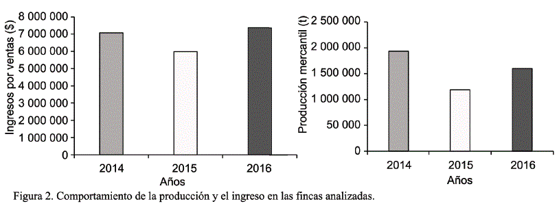 Al estudiar la evolución de estas fincas, en lo referido a la producción mercantil y los ingresos, se pudo verificar que las seis fincas seleccionadas para el estudio fueron muy productivas y rentables durante los tres años (fig. 2). Los indicadores de producción e ingresos documentados para el estudio mostraron un incremento (de 2014 a 2016) en todos los sistemas estudiados; lo que evidenció mejoras sustantivas en términos de incremento de las producciones, para consumo familiar y local, y también de ampliación de las posibilidades económicas para las familias vinculadas a las fincas. Por su parte, los resultados productivos de 2015 estuvieron limitados, en algunos casos, por la severa sequía que afectó los cultivos de granos y tomate, pues Matanzas se encontraba entre las provincias clasificadas con sequía extrema y severa a nivel nacional3.