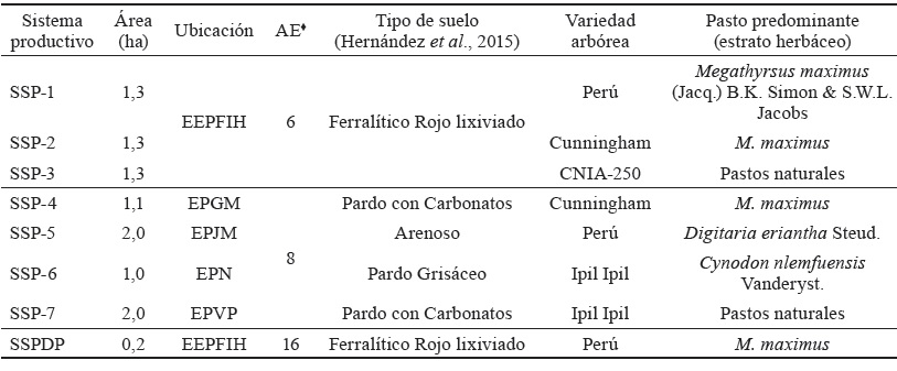 Las áreas experimentales se correspondieron con SSP (cuartones) compuestos por asociaciones de las cuatro variedades comerciales de la leguminosa arbórea Leucaena leucocephala (Lam.) de Wit –aprobadas en Cuba, según MINAG (2017)– y diferentes gramíneas pratenses, las cuales tenían las particularidades que se relacionan en la tabla 1.
