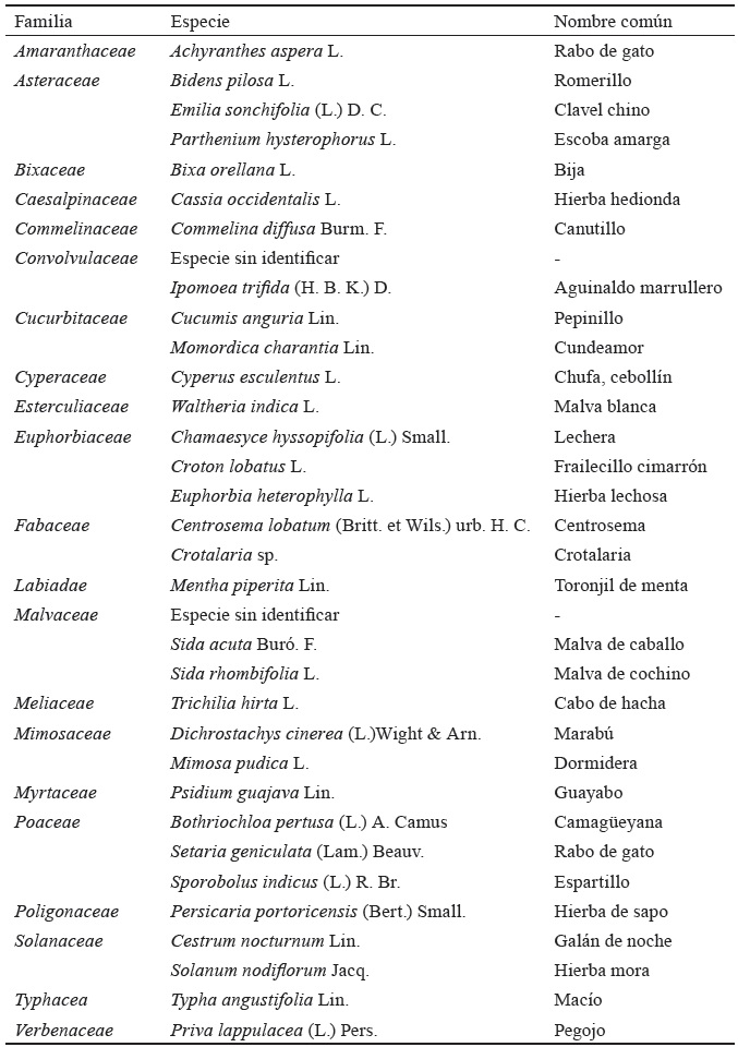 De estas arvenses sobresalieron M. pudica y S. rhombifolia, presentes en cinco de las áreas; D. cinerea, en cuatro; y S. geniculata, A. aspera y P. guajava, en tres, las cuales son consideradas especies típicas de los pastizales en Cuba según los informes del sector ganadero.