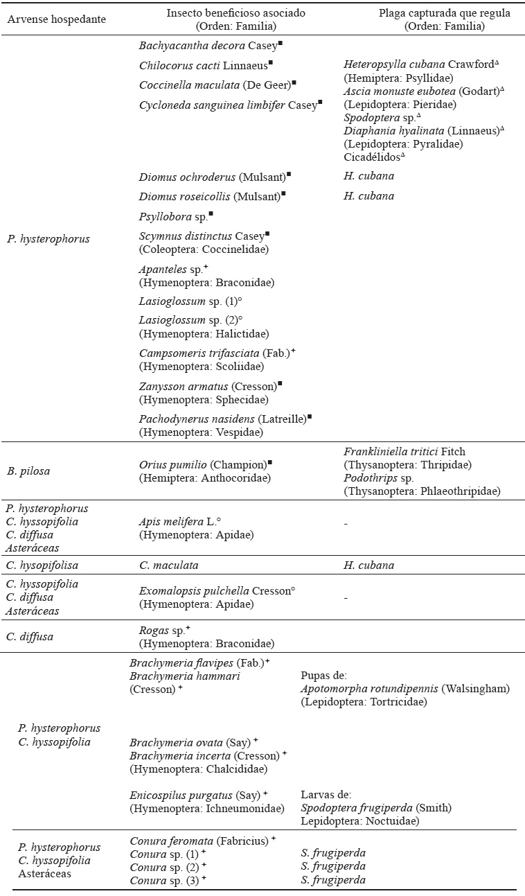 Cinco arvenses y otra Asterácea, las cuales representaron el 15 % del total, se consideran como posibles hospedantes de 27 de los controles biológicos capturados (11 depredadores, 12 parasitoides y 4 beneficiosos, también polinizadores). Entre los depredadores sobresalieron los coccinélidos C. cacti, C. maculata, C. sanguinea limbifer, D. ochroderus y D. roseicollis como biorreguladores de H. cubana y el antocórido O. pumilio, controlador de F. tritici y Podothrips sp. De los parasitoides, se destacaron el ineumónido E. purgatus y los cálcidos Conura spp., que regulan a S. frugiperda; asimismo, se distinguió la abeja A. melifera como polinizador.
