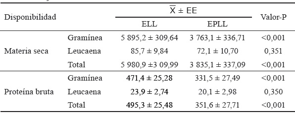La disponibilidad de PB de la gramínea fue alta en ambas épocas del año, pero significativamente superior (p < 0,001) en la ELL debido a la mayor disponibilidad de MS que manifestó el pasto en esa época. En cambio, la disponibilidad de PB de L. leucocephala fue baja y similar para las dos épocas. Ello determinó que la disponibilidad de proteína bruta total siguiera la misma tendencia que la disponibilidad de PB de la gramínea, con diferencias significativas (p < 0,001) favorables a la ELL.