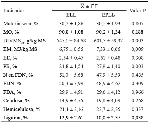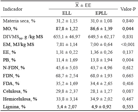 El valor de EM fue superior (p = 0,009) en la EPLL en relación con la ELL. Estos datos superan el valor informado por Rodríguez et al. (2014) en la harina del follaje de L. leucocephala (6,3 MJ/kg de MS); sin embargo, son inferiores a los 8,4 MJ/kg de MS informados por Heuzé y Tran (2015) para la biomasa comestible de esta planta, en ambos casos estimados mediante producción de gas in vitro.