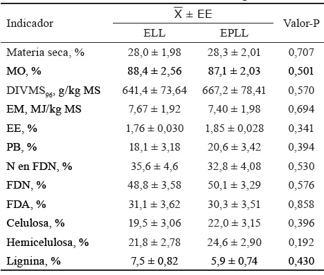 Los indicadores del valor nutricional de M. maximus por época del año se presentan en la tabla 4. El contenido de MO fue óptimo y presentó valores superiores (p = 0,044) en la ELL. La DIVMS a las 96 h fue elevada y mostró el mismo comportamiento en ambas épocas del año, con valores promedio de 655,1 y 649,5 g/kg de MS para la ELL y la EPLL, respectivamente, que están en el rango recomendado por Arango et al. (2016) para esta especie (600-700 g/kg de MS). Además, dichos valores son similares al informado por Santiago-Hernández et al. (2016) en un sistema de M. maximus vcs. Mombaza y Tanzania (657,0 g/kg de MS) asociados con Melia azedarach L., sembrada con una densidad de 1 000 plantas por hectárea. Sin embargo, son ligeramente superiores a los obtenidos por Frota et al. (2017) en M. maximus vc. Mombaza en asociación con Attalea speciosa Mart. (629,9 y 609,8 g/kg de MS para la ELL y la EPLL, respectivamente).