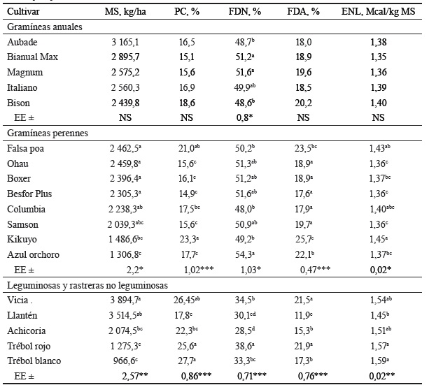 En cuanto a los cultivares de raigrás, cuando estos se evaluaron en la época de altas precipitaciones se obtuvieron rendimientos similares a los reportados en un estudio sobre la adaptación de cultivares de raigrás en el trópico alto de Nariño (Cadena et al., 2019b), con más de 2 000 kg de MS/ha/corte.