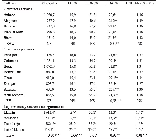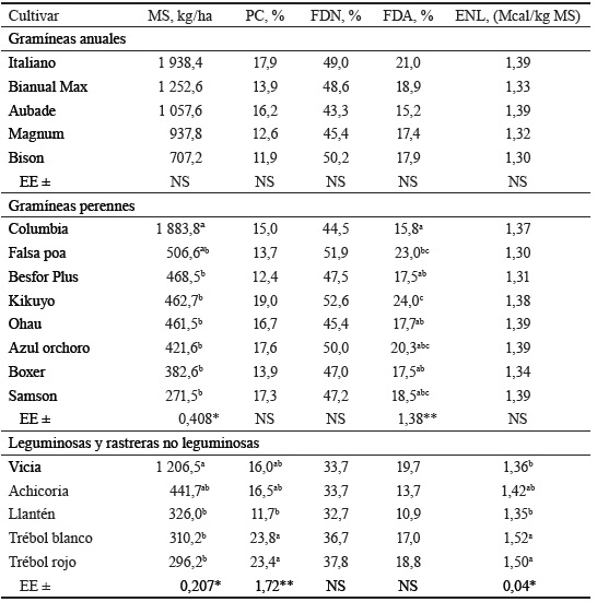 No se encontraron diferencias significativas para las gramíneas anuales; sin embargo, los genotipos de mayor rendimiento en MS fueron Italiano y Bianual Max. En las gramíneas perennes se hallaron diferencias en las variables MS y FDA; se destacó el raigrás Clolumbia con el rendimiento de MS más alto y el menor valor de FDA (tabla 4).